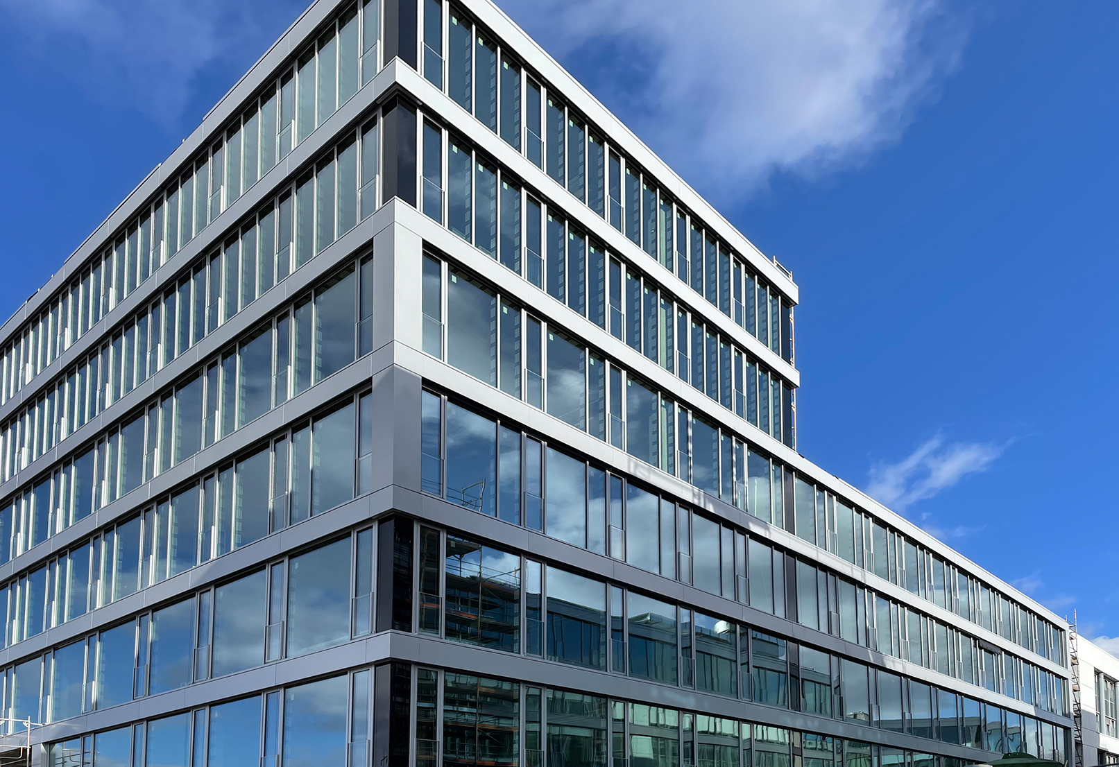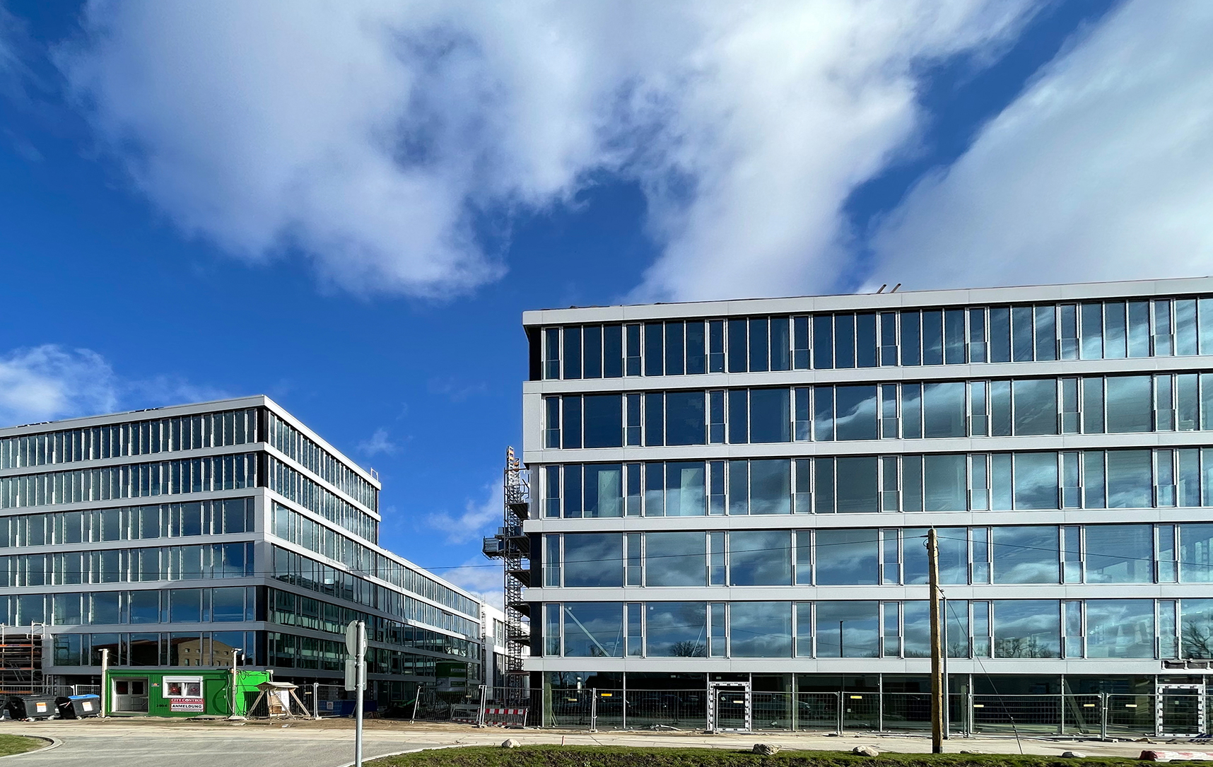 The expansion of the BB Business Hub on Mittelstrasse in Schönefeld is nearing completion. Alpine Finanz is expanding its corporate campus here in the form of a seven-storey new building. The facade works are now finished. The scaffolding is being dismantled to reveal the striking glass and steel facade.