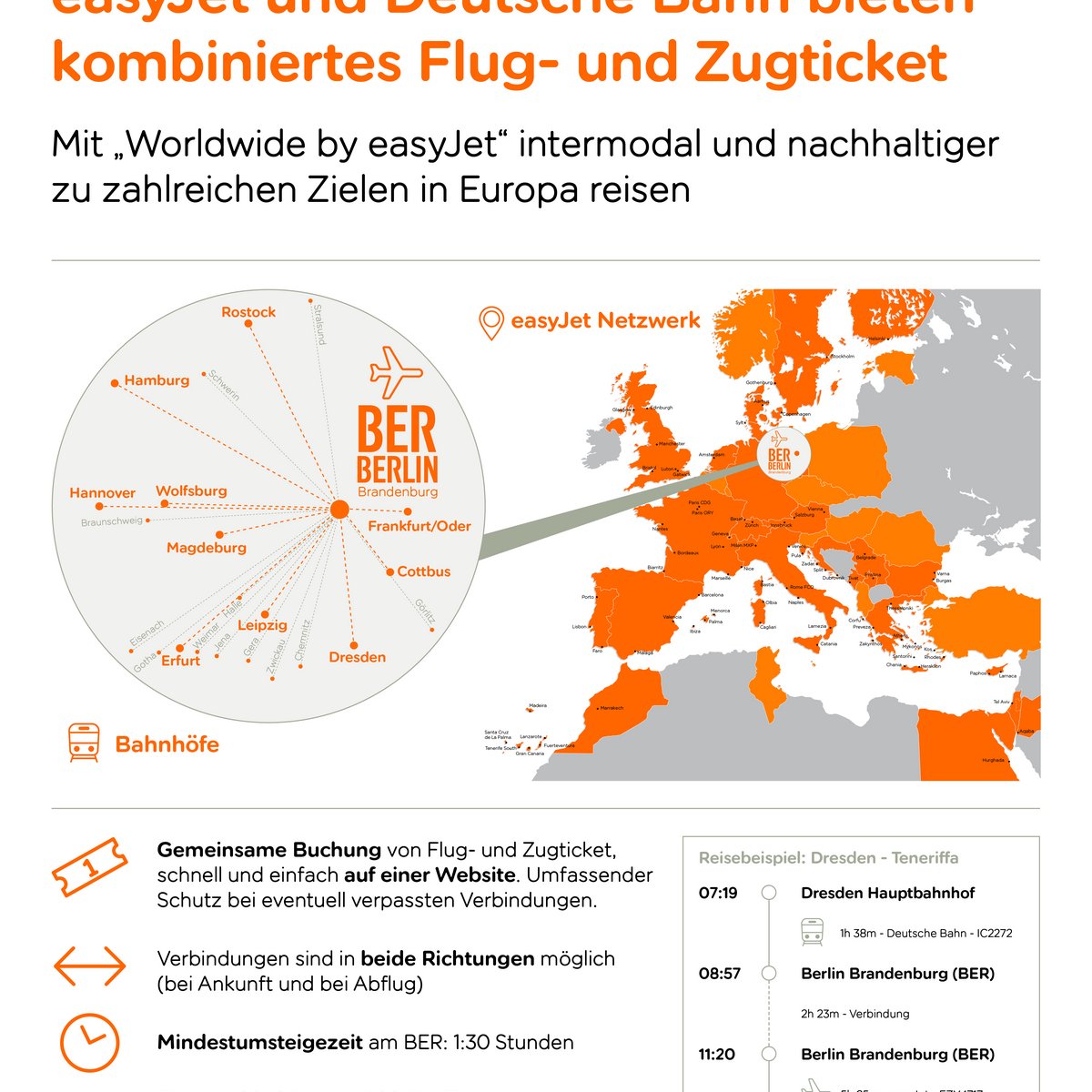 easyJet, Europe’s leading airline, now makes it possible for easyJet customers to combine flight and rail tickets easily and conveniently in one booking process. This is done by means of the new cooperation with Deutsche Bahn (DB) as part of the “Worldwide by easyJet” program. The intermodal linking of air and rail travel is initially possible via Berlin Brandenburg Airport (BER). With the DB cooperation, easyJet is underlining its position as the home airline for Berlin-Brandenburg, as it expands the catchment area of BER to the surrounding Federal States with the intermodal travel connection and connects it seamlessly with travel destinations across Europe. The first-time connection with the train makes it possible to make the journeys of our customers even more sustainable.